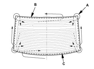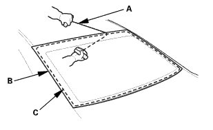 4. Apply glass primer to the edge of the rear window (A) where the new lower rubber dam (B) will be attached as shown. Attach the lower rubber dam with adhesive tape (C) to the lower edge of the rear window:
