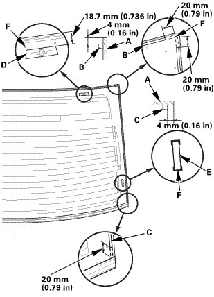 5. Apply glass primer to the upper clip mounting areas on the rear window (A), and let it dry. Attach the upper rubber dam (B), the side rubber dams (C), the clips (D), and the side fasteners (E) with adhesive tape to the inside face of the rear window as shown: