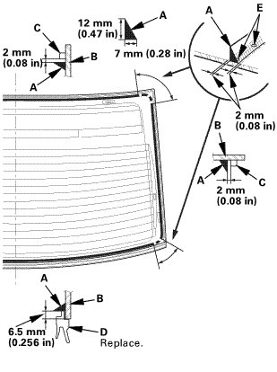 * Apply the glass primer to the corner areas of the rear window using the printed dots (E) on the rear window as a guide.