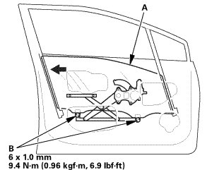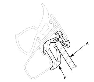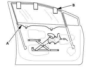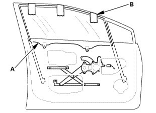 5. Raise the glass fully, and check for gaps. Also make sure that the glass (A) contacts the glass run channel (B) evenly.