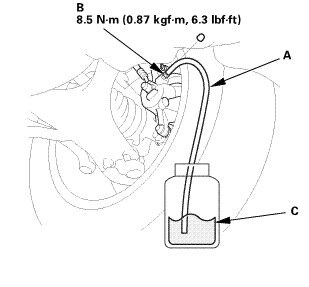 6. Submerge the other end of the drain tube into a clear plastic catch bottle of brake fluid (C).