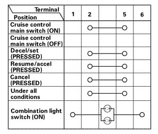 1. Check for continuity between the terminals in each cruise control combination switch position according to the table: