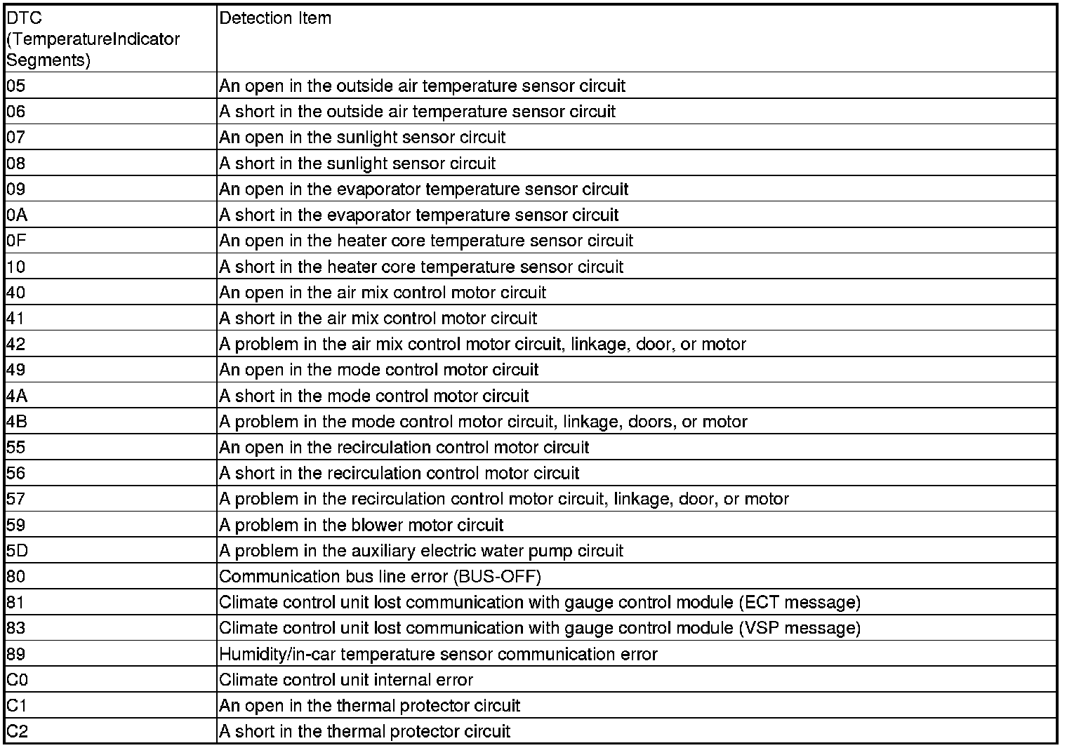 NOTE: If temperature indicator segments 05, 07, 09, 0F, and 89 are on at the some time, there may be an open in the sensor common ground wire.