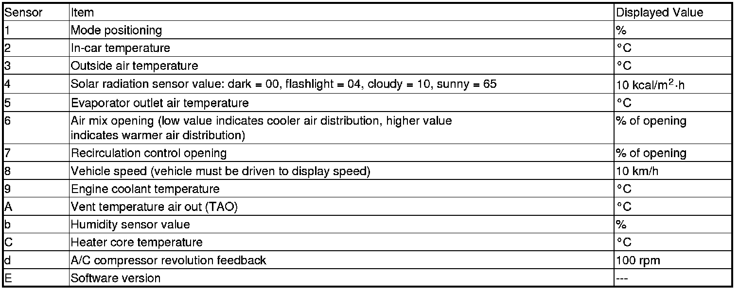 The climate control unit has a mode that displays the sensor inputs it receives. This mode shows you what the climate control unit is receiving from each of the sensors, one at a time, and it can help you determine if a sensor is faulty.