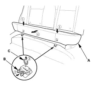 1. Install the hooks (A) in the rear seat cushion clips (B).
