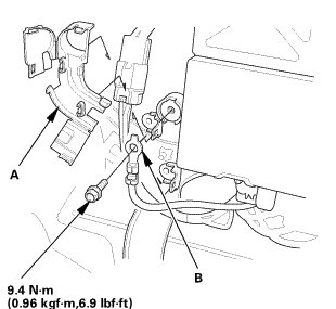 2. Install the bolt (A) securing the rear seat cushion (B).