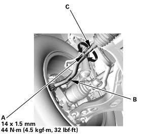 1. Loosen the tie-rod end locknuts (A) while holding the flat surface sections (B) of the tie-rod end with a wrench, and turn both tie-rods (C) until the front toe is within specifications.