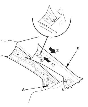 4. Lightly push the A-pillar trim (B) into place, then install the trim.