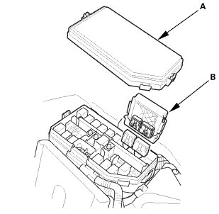 2. Remove the relay control module (B) from the under-hood fuse/relay box.