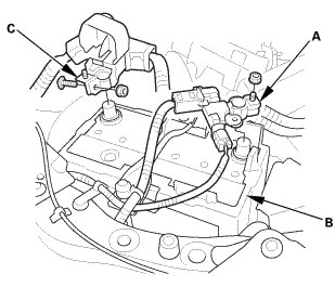 3. Disconnect the positive cable (C) from the 12 volt battery.