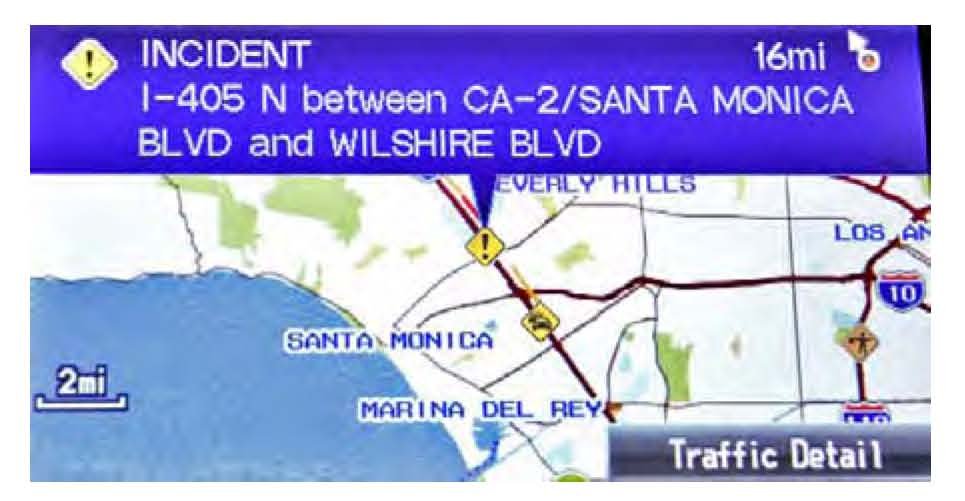 TMC is available in many metropolitan areas. The amount and type of coverage varies. Traffic incidents (diamond-shaped icons) are shown on the screen for most metropolitan cities. Many of these cities also display traffic flow, shown as red or orange bands, alongside major roads or freeways.