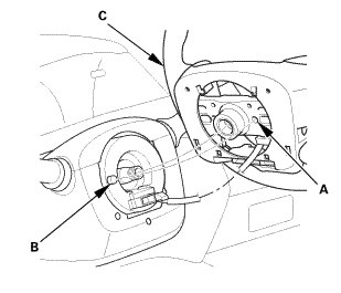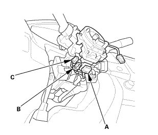 1. Disconnect cable reel connector A and B on the dashboard wire harness, and the steering angle sensor connector (C).