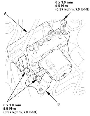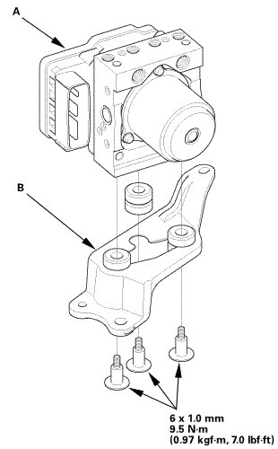 2. Install the VSA modulator-control unit (A) with the bracket (B).