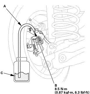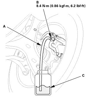 4. Submerge the other end of the drain tube into a clear plastic catch bottle of brake fluid (C).