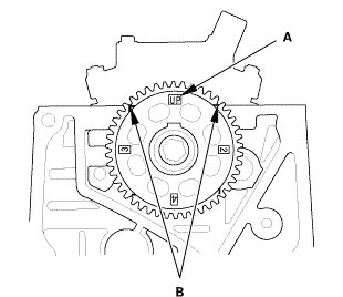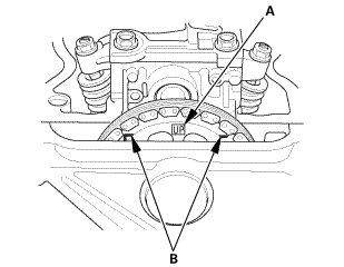1. Set the camshaft to TDC. The "UP" mark (A) on the camshaft sprocket should be at the top, and the TDC grooves (B) on the camshaft sprocket should line up with the top edge of the head.