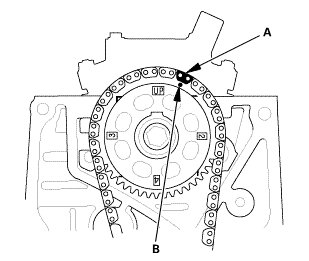 1. Install the cam chain on the crankshaft sprocket with the colored piece (A) aligned with the mark (B) on the crankshaft sprocket.