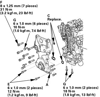 8. Loosely install the dowel bolts (E), then tighten the 8mmbolts (F), the 6 mm bolts (G) and the dowel bolts.