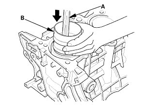 4. Position the piston/connecting rod assembly in the cylinder, and tap it in using the wooden handle of a hammer (A). Push down on the ring compressor (B) to prevent the rings from expanding before entering the cylinder bore.