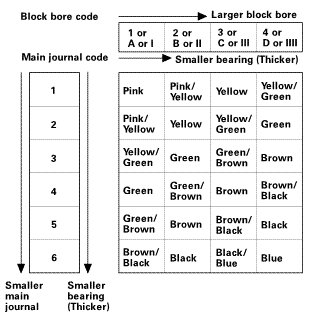 3. Use the block bore codes and the main journal codes to select the appropriate replacement bearings from the following table.
