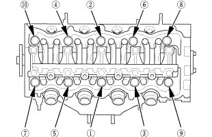 8. Torque the cylinder head bolts in sequence to 40 Nm (4.1 kgfm, 30 lbfft). Use a beam-type torque wrench. When using a preset click-type torque wrench, be sure to tighten slowly and do not overtighten. If a bolt makes any noise while you are torquing it, loosen the bolt and retighten it from the first step.
