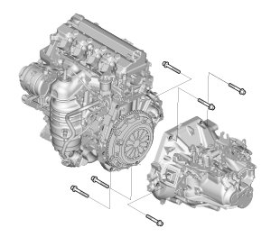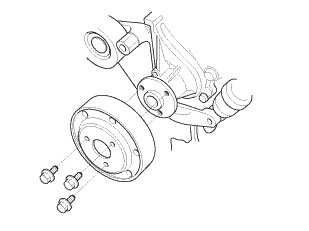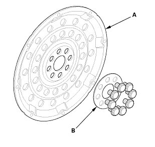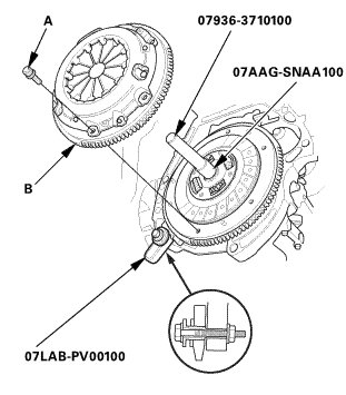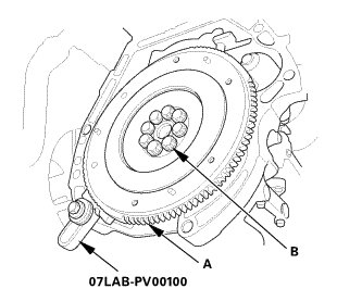 NOTE: Loosen the flywheel mounting bolts (B) in a crisscross pattern in several steps.
