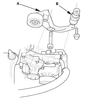 2. Check for oil leaks from the drive belt auto-tensioner damper (B) and check for damage to the damper rubber.