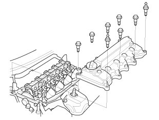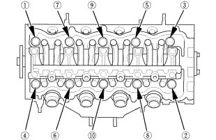 1. Remove the cylinder head bolts. To prevent warpage, loosen the bolts in sequence, 1/3 turn at a time, repeat the sequence until all bolts are loosened.