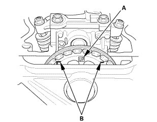 1. Set the No. 1 piston at top dead center (TDC). The "UP" mark (A) on the camshaft sprocket should be at the top, and the TDC grooves (B) on the camshaft sprocket should line up with the top edge of the head.
