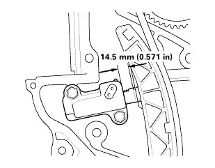 1. Measure the tensioner rod length between the tensioner body and bottom of the flat surface section on the tensioner rod. If the length is more than the service limit, replace the cam chain.