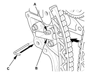 4. Rotate the crankshaft counterclockwise to align the holes on the lock (A) and the auto-tensioner (B).