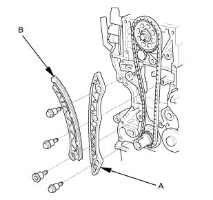 1. Remove the cam chain guide (A) and the cam chain tensioner arm (B).