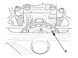 8. Rotate the crankshaft clockwise. Align the No. 4 piston TDC groove (A) on the camshaft sprocket with the top edge of the head.
