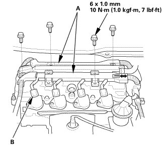 1. Install the intake manifold assembly (A) with new gaskets (B).
