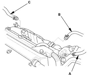 7. Connect the EVAP canister hose (A), the brake booster vacuum hose (B), and the PCV hose (C).