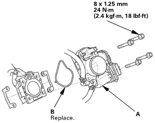 1. Install the throttle body (A) with new O-ring (B).