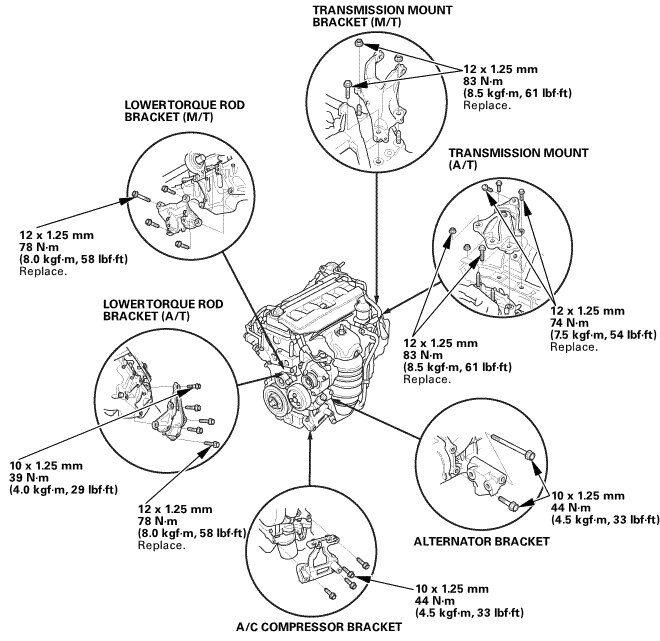 NOTE: Reinstall the mounting bolts/support nuts in the sequence given in the following steps. Failure to follow this sequence may cause excessive noise and vibration, and reduce engine mount life.