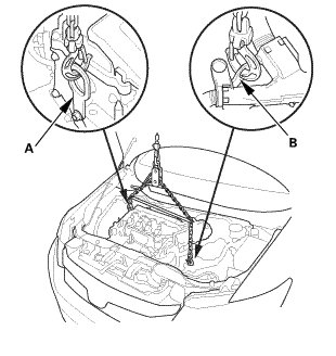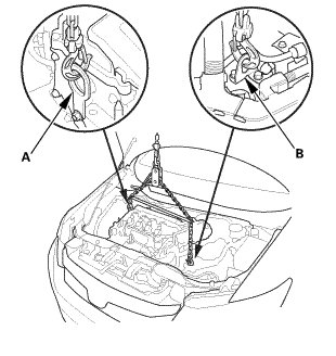 1. Lower the vehicle, attach the chain hoist with the engine hanger stay to the universal lifting eyelet (A) and the transmission hanger (B).