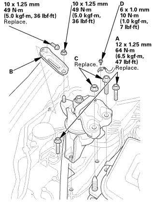 1. Install the new side engine mount mounting bolts (A) and the side engine mount bracket (B) using a nut and a new bolt, then loosely install the new side engine mount bracket mounting bolts and nut (C).