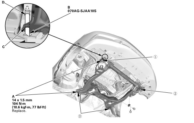 2. Insert the subframe alignment pin (B) through the positioning hole (C) on the right front subframe, and into the positioning hole (D) on the body, then loosely tighten the subframe right front mounting bolt.