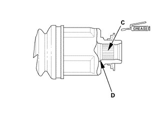 7. Right driveshaft (with intermediate shaft): After applying grease, remove the grease from the splined grooves at intervals of 2-3 splines and from the set ring groove (D) so that air can bleed from the intermediate shaft.