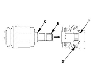 14. Right driveshaft (without intermediate shaft): Insert the inboard end (C) of the driveshaft into the differential (D) until the set ring (E) locks in the groove (F).