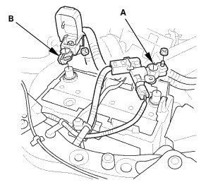 3. Connect the negative cable and battery sensor (B) to the battery.