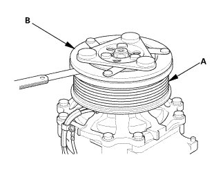 4. Measure the clearance between the rotor pulley (A) and the armature plate (B) all the way around. If the clearance is not within specified limits, remove the armature plate and add or remove shims as needed to increase or decrease clearance.