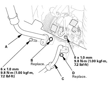 4. Connect the discharge hose (C) with a new O-ring (D) that is lubricated with clean refrigerant oil.