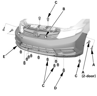 1. Remove the screws (A), the bolts (B), and the clips (C, D) securing the front bumper (E).