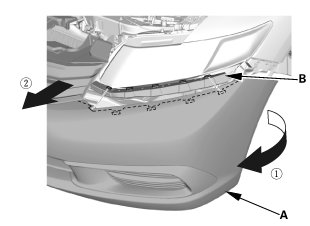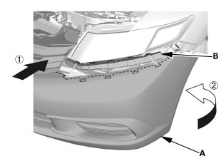 3. With the help of an assistant, pull out both sides of the front bumper (A) from the upper beam (B).
