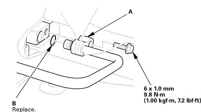 2. Connect the discharge hose (A) with a new O-ring (B) that is lubricated with clean refrigerant oil.