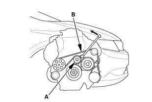 1. Move the auto-tensioner (A) counterclockwise to relieve tension from the drive belt (B).