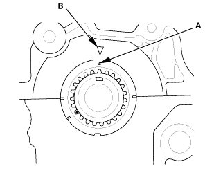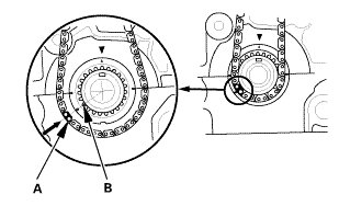 Cam chain and camshaft sprocket with the colored link plate (A) aligned with the mark (B)
