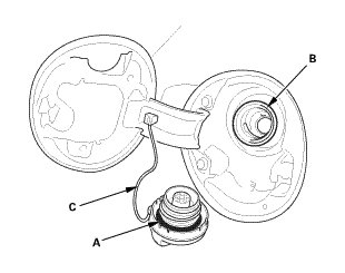 -1. Check the fuel fill cap seal (A) and the fuel fill pipe mating surface (B). Verify that the fuel fill cap tether cord (C) is not caught under the cap.